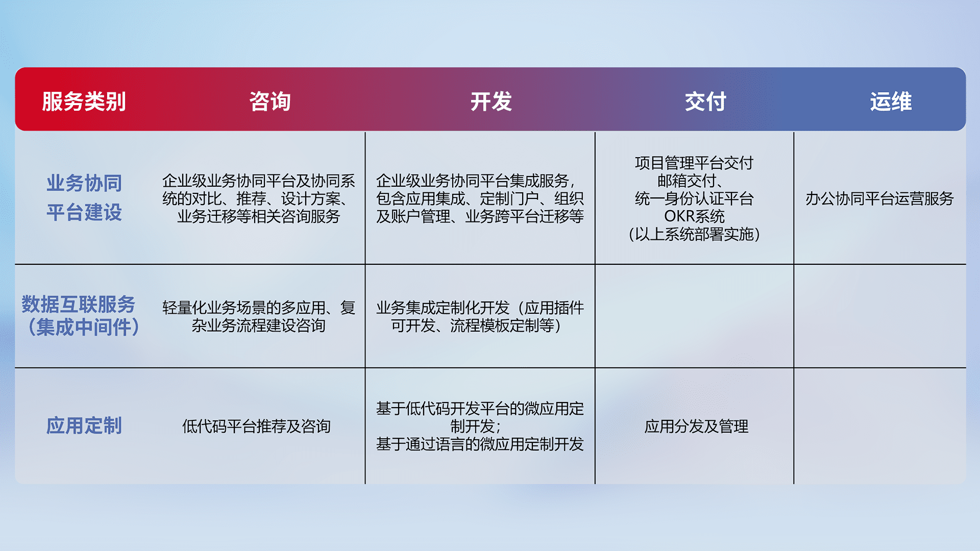 针对钉钉、、、企微、、、IDaas等平台级产品提供产品的规划、、、、方案、、、、交付、、、定制化开发等服务,,,实现如统一协同办公、、、智能客户服务、、混合会议管理、、智能数据查询、、、、等业务场景,,,,实现数字化转型。。。
