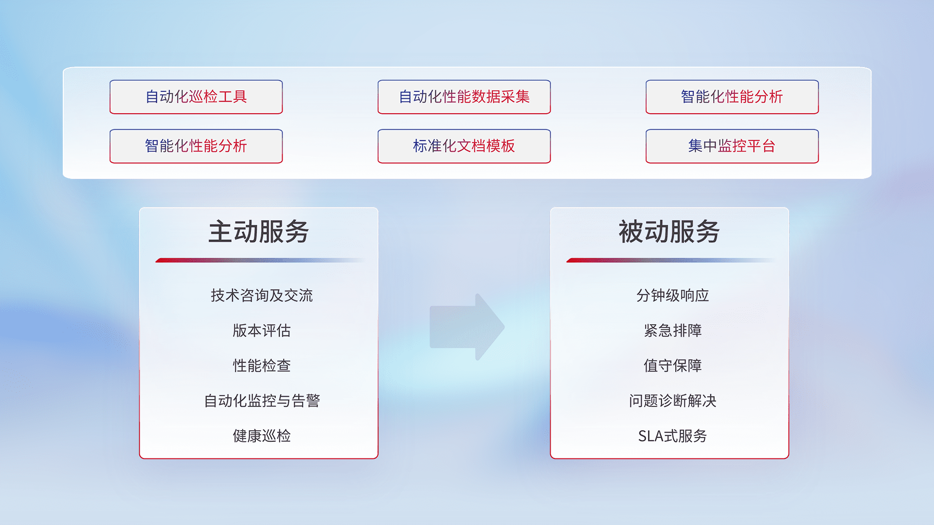 智能化工具和标准化文档,,,保障服务质量,,,提供主动服务(包含技术咨询、、、、版本评估、、、、性能检查、、、、自动化监控与告警、、健康巡检)和被动服务包含(分钟级响应、、、紧急排障、、、值守保障、、、问题诊断解决、、、、SLA服务)。。。